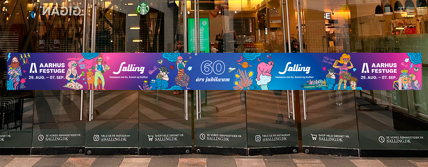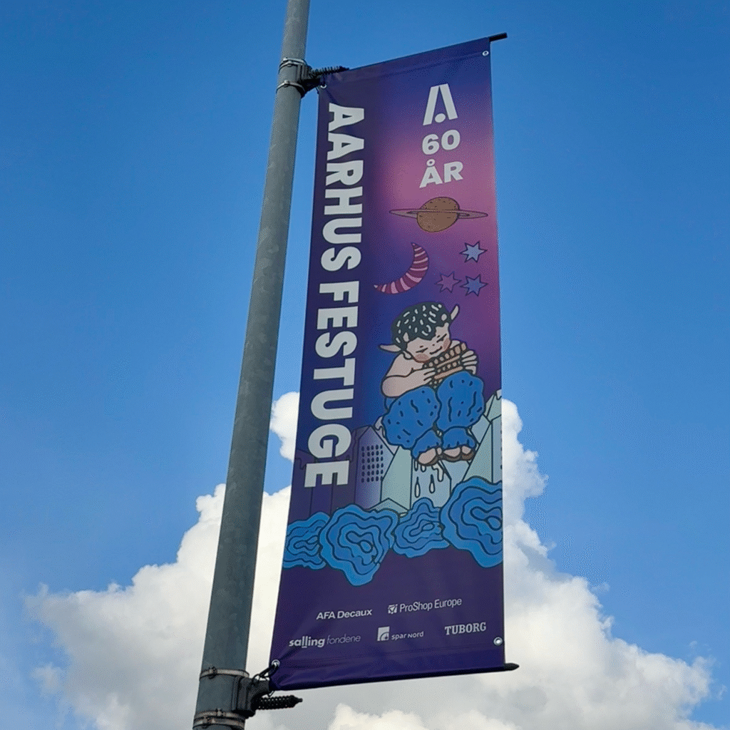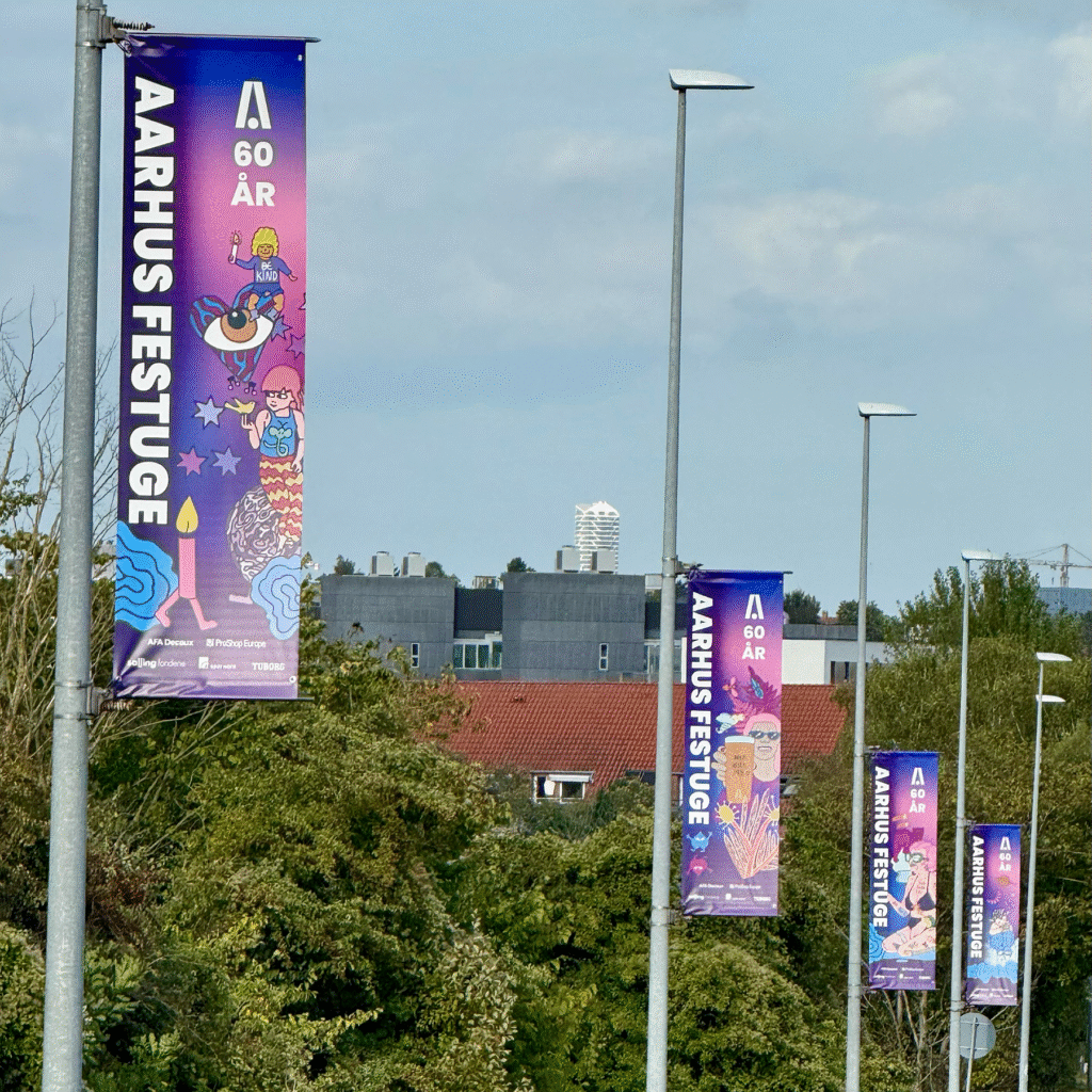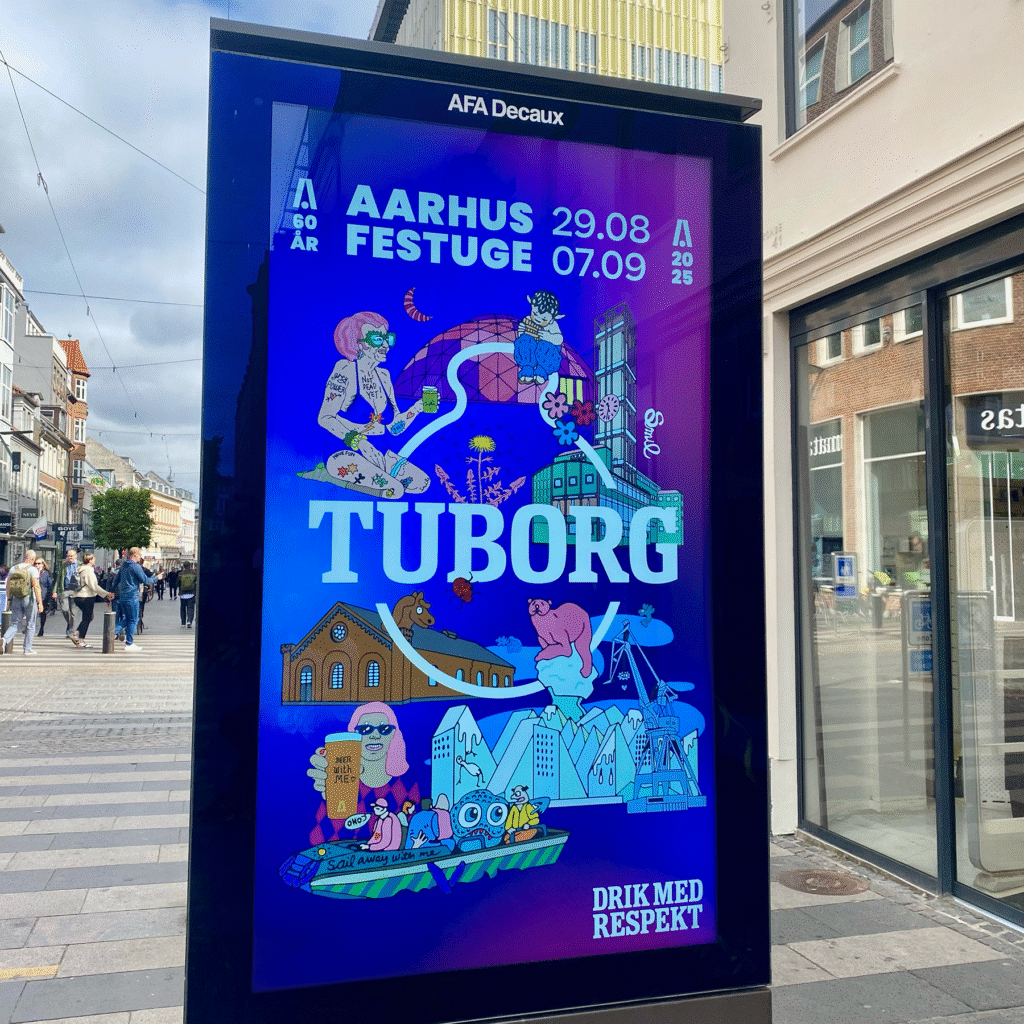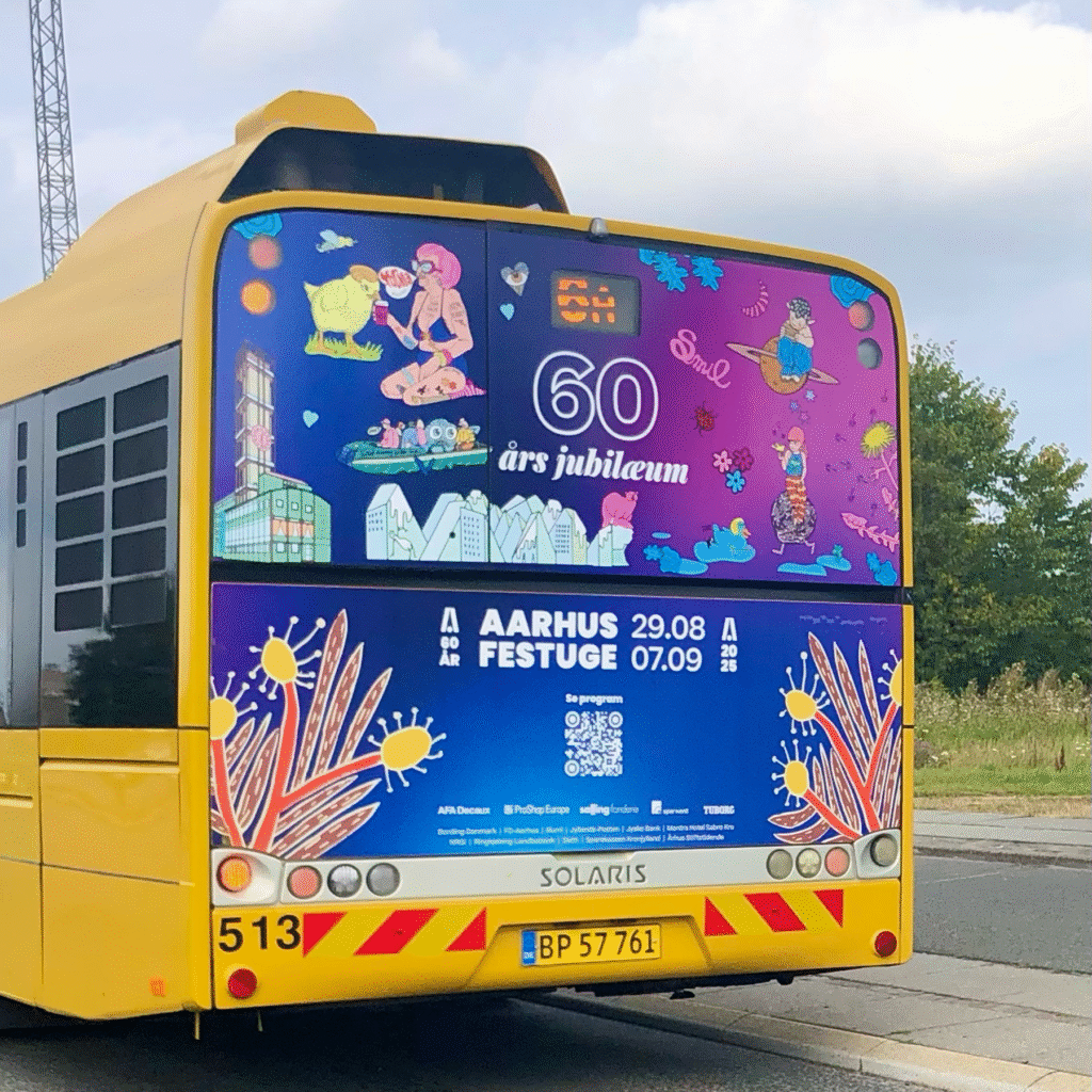 I min praktik hos Aarhus Festuge har jeg layoutet en række grafiske designs til anvendelse i det fysiske bybillede, herunder abribus i samarbejde med Tuborg, busbagsider, folie til Salling, lygtepælsbannere og et klistermærke til Festugens biler under kulturbegivenheden. Formålet var at skabe et visuelt stærkt og genkendeligt udtryk, der kunne fungere i større skalaer og på forskellige flader med udgangspunkt i Aarhus Festuges eksisterende visuelle identitet. Her arbejdede jeg primært i InDesign.