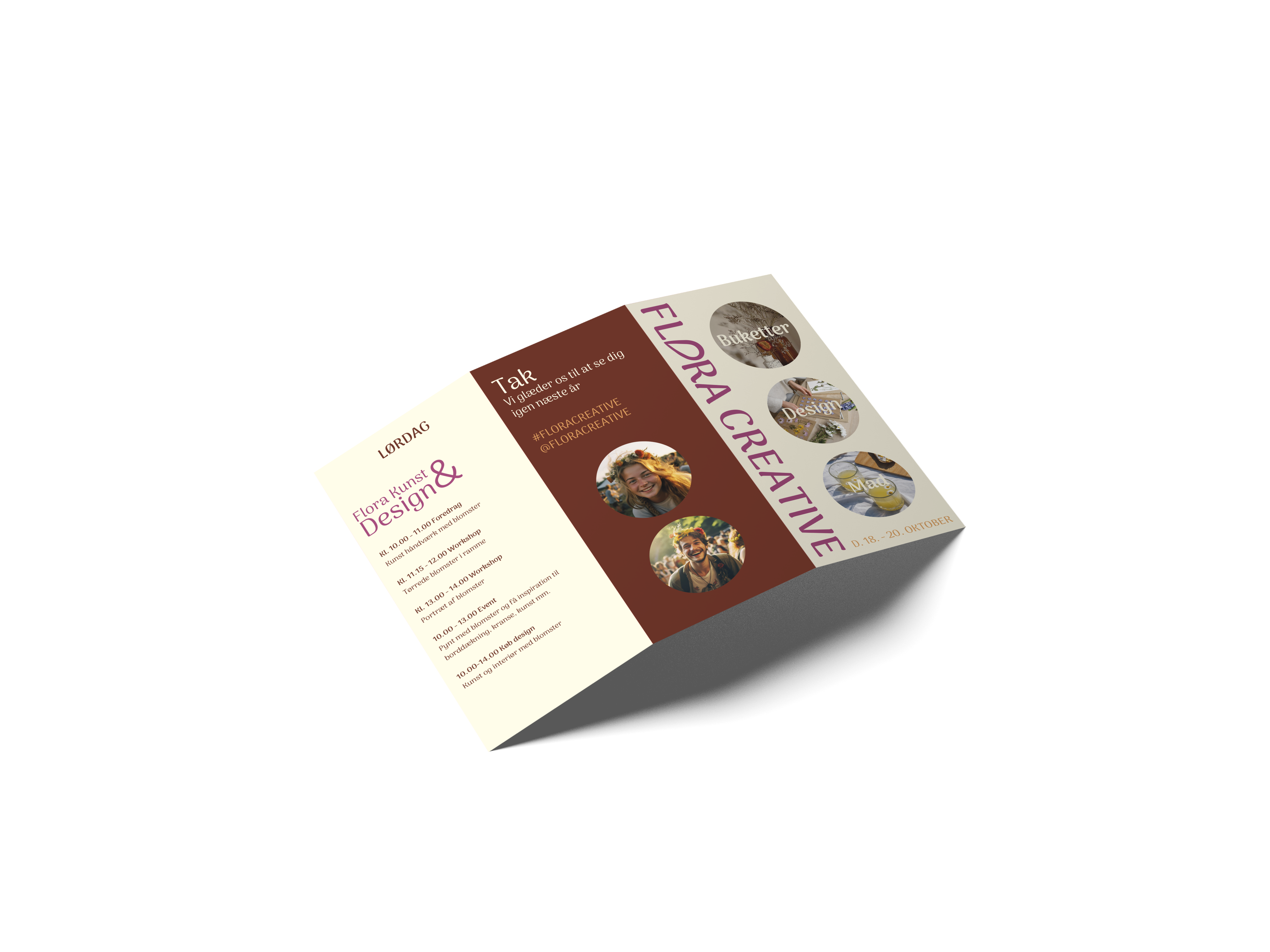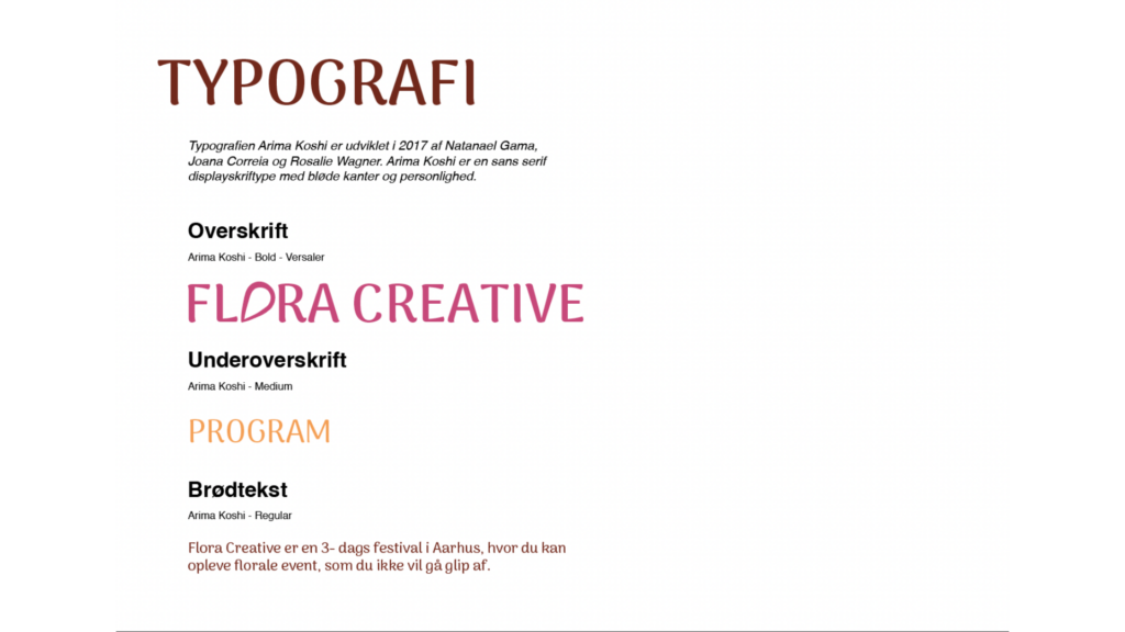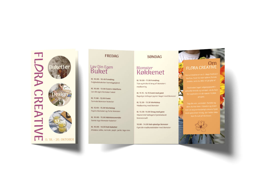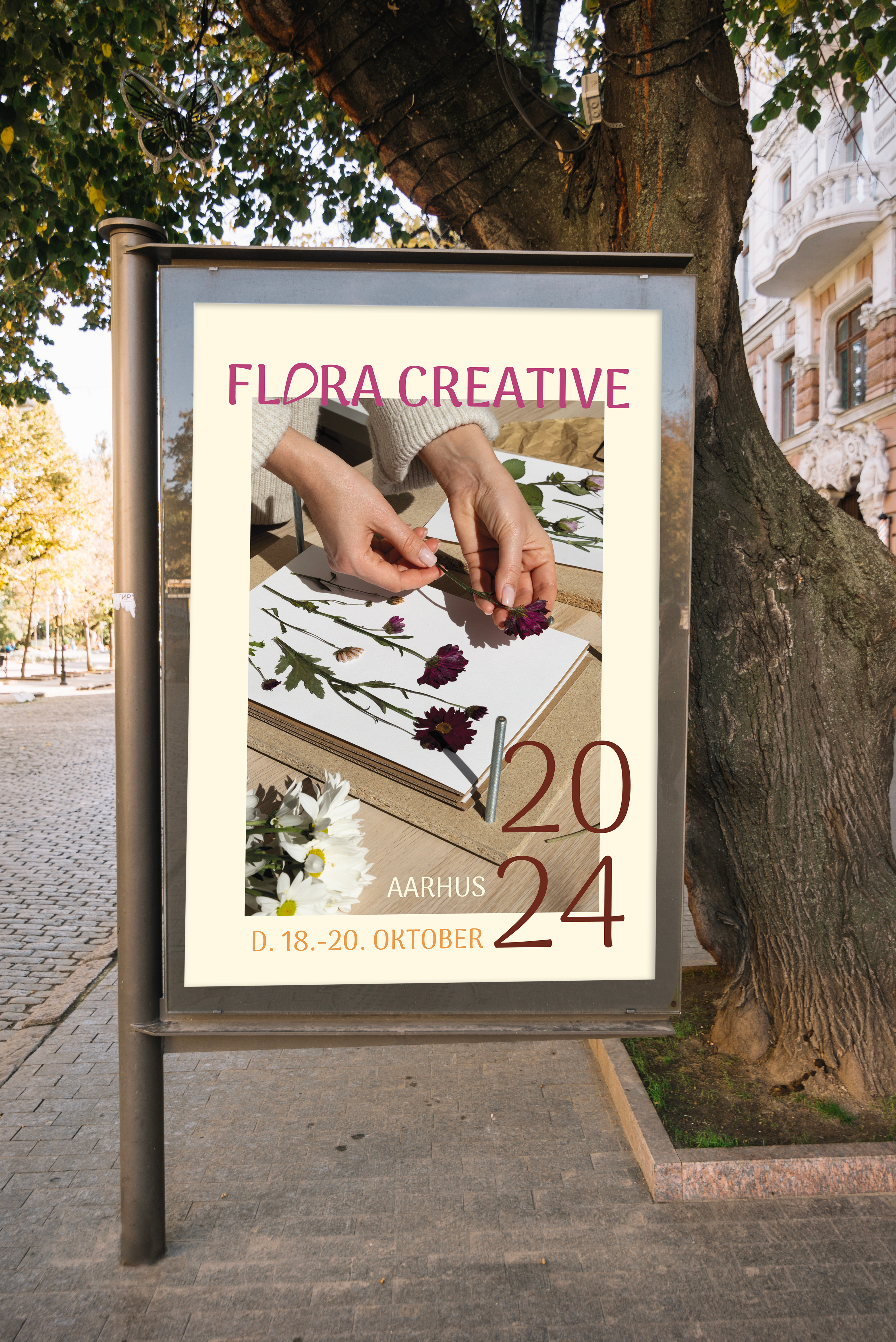 ‘Flora Creative’ er en fiktiv blomster festival, som har fokus på kreativitet og bæredygtighed. Jeg har designet en visuel identitet for festivalen, der tager udgangspunkt i grafisk design, konceptudvikling og storytelling. Her har jeg gennem en længere designproces udarbejdet en folder, plakat, webdesign, t-shirt design og festivals armbånd for festivalen, som altsammen er designet ud fra den udarbejdede designguide til festivalen.